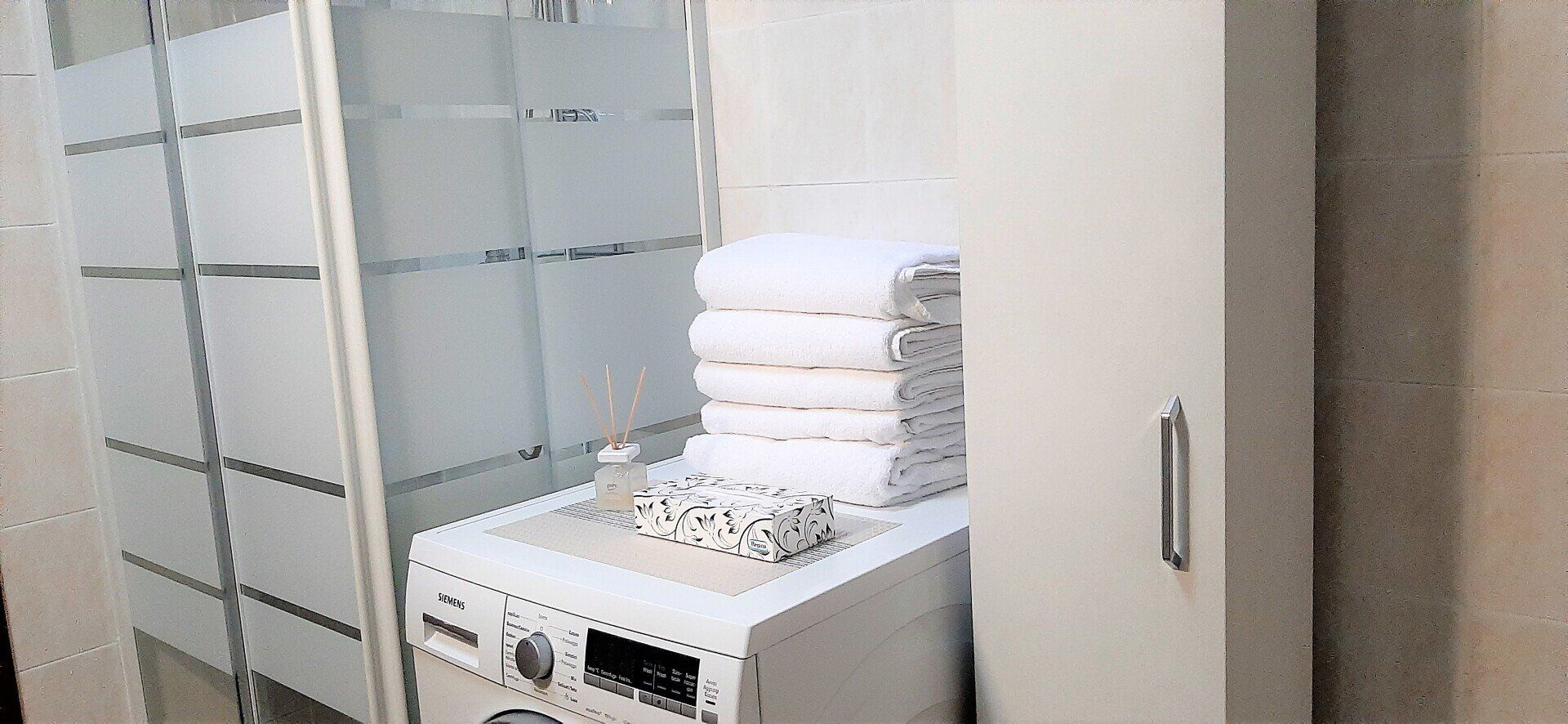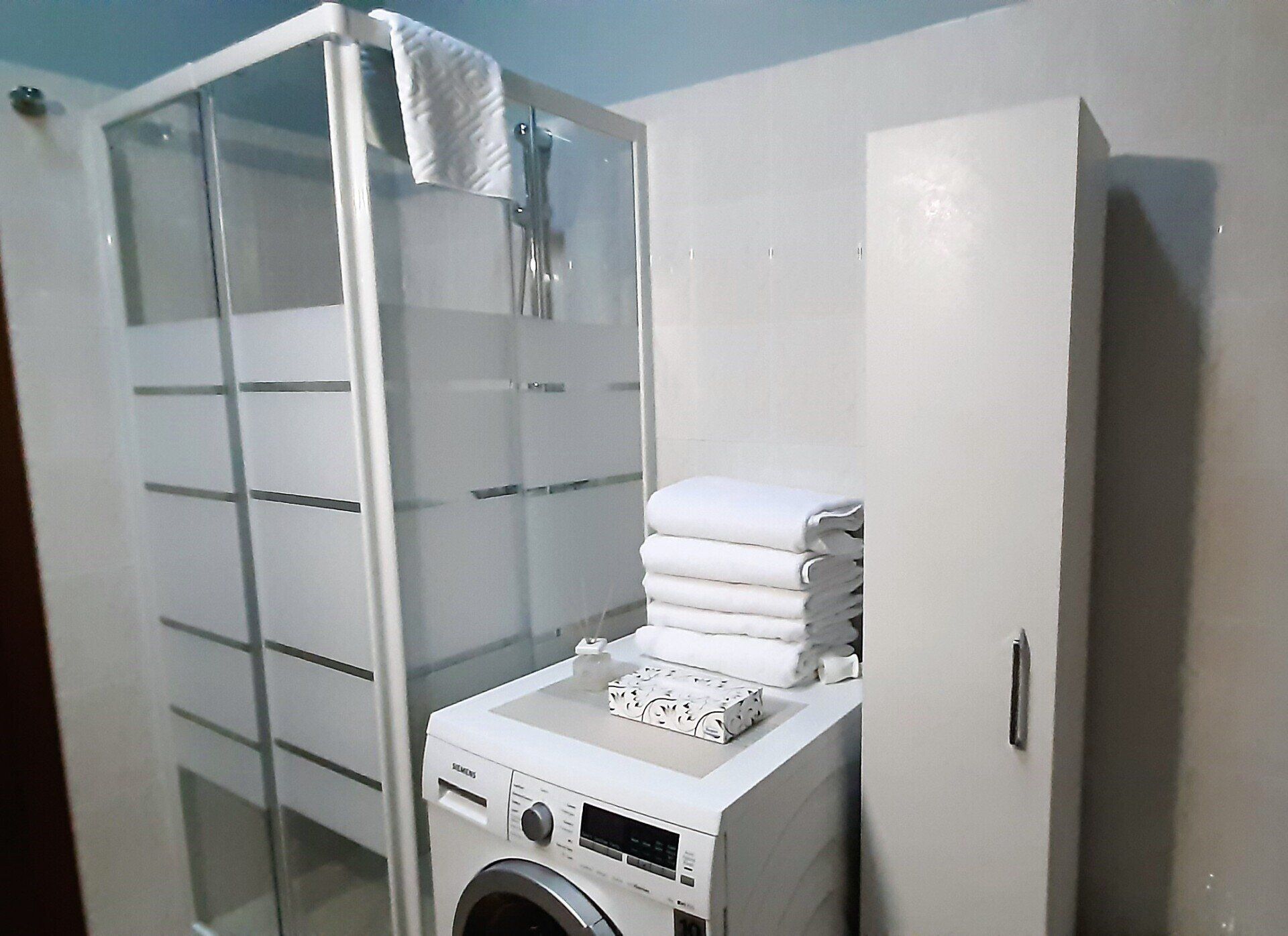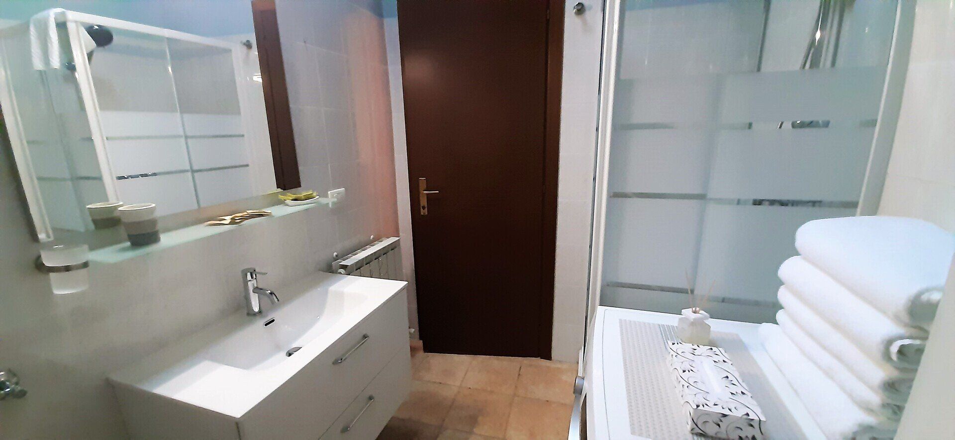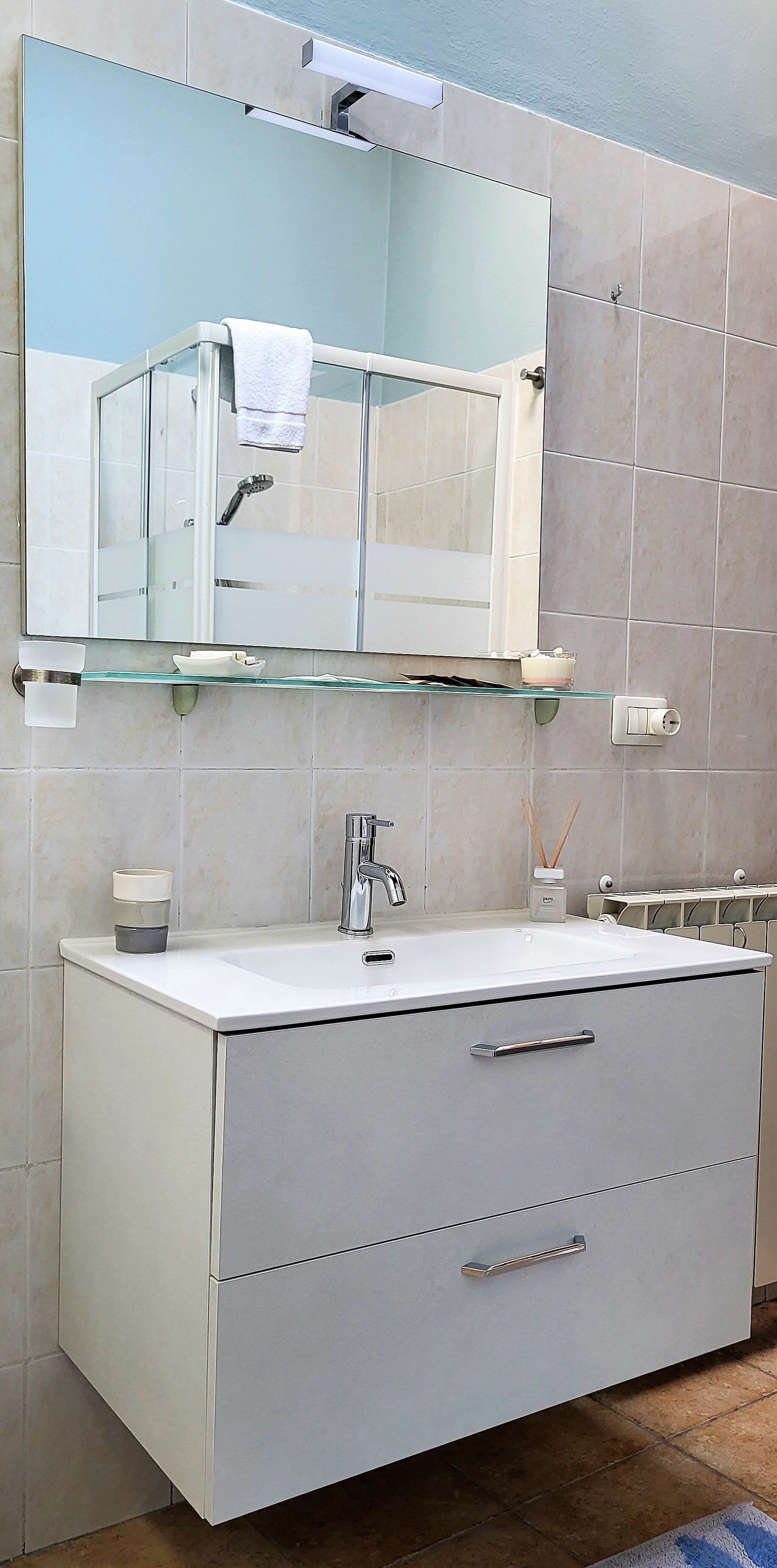Il bagno è dotato di finestra Velux ed è completo di doccia, asciugacapelli, asciugamani e set di cortesia con prodotti naturali all’olio di oliva